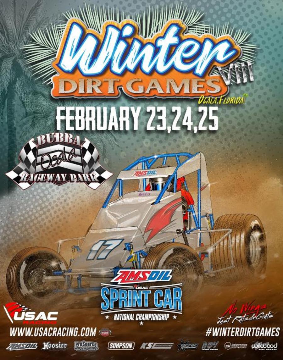 "Winter Dirt Games" continues as scheduled Friday night, February 24 and Saturday night, February 25 at the 3/8-mile D-shaped dirt oval in Ocala, Fla. On Friday night, the pit area opens at 5pm, front gates open at 6pm and hot laps at 7:15pm. Racing is set to begin at 8pm. On Saturday night, the activities begin one hour earlier. The pits open at 4pm, front gates open at 5pm and hot laps at 6:15pm. Racing is set to begin at 7pm. Tickets each night are $20 for children 11-15, $30 for adults and $40 for a pit pass.